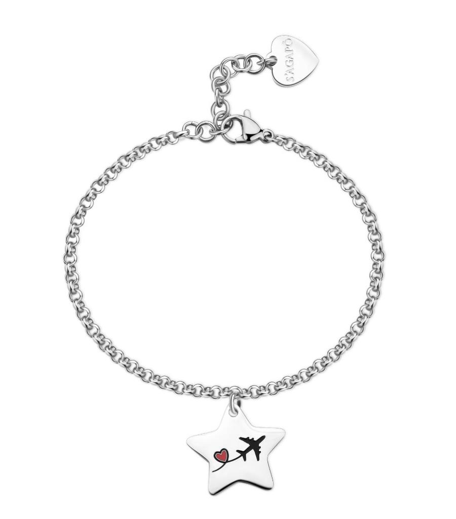 Bracciale in acciaio 316L con pendente a forma di stella con aereo in smalto nero e cuore in smalto rosso su fronte e scritta "Non importa dove vai, ma con chi vai" in smalto nero su retro.