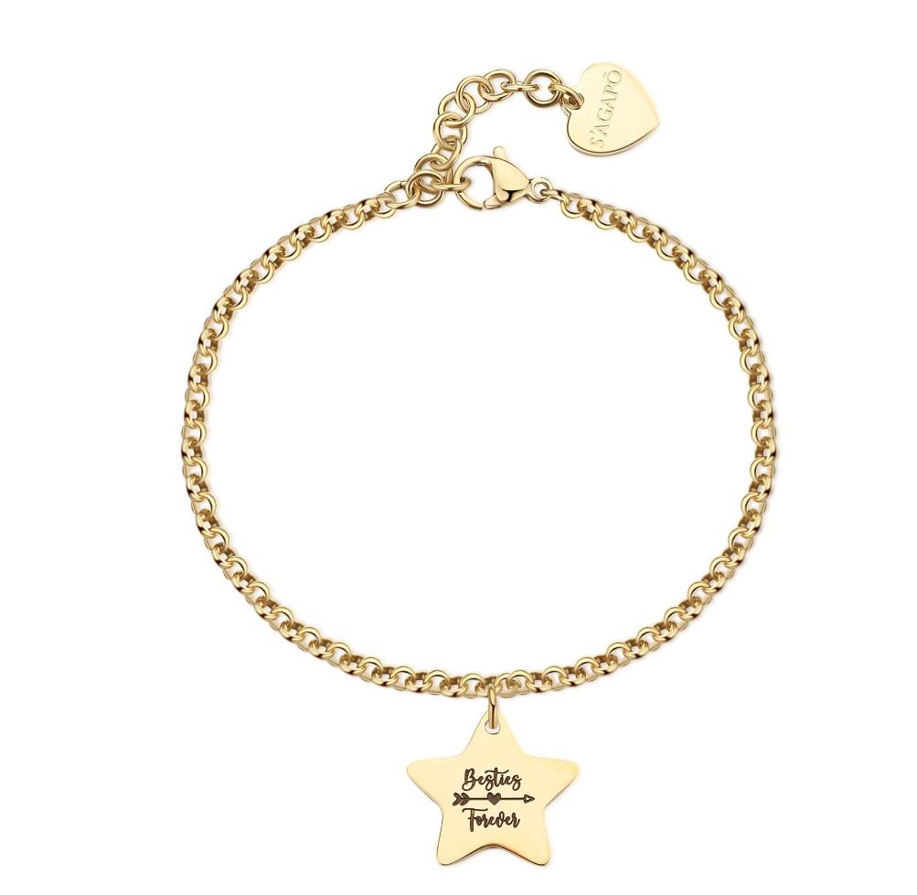 Bracciale in acciaio 316L con finitura pvd oro 14K e pendente a forma di stella con scritta "Besties forever" in smalto nero su fronte e scritta "My best friend" in smalto nero su retro.