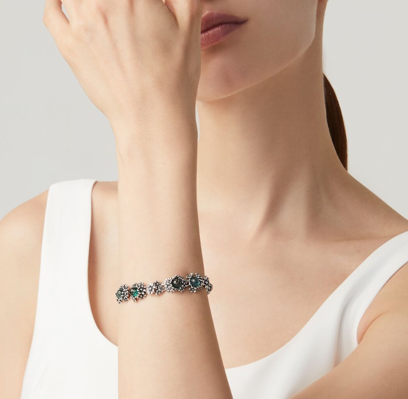 Gemme di un profondo verde che rilucono nel prato di delicate micro-margherite d’argento brunito per questo elegante bracciale. Nei piccoli mondi c’è un fascino e un’eleganza che parlano al cuore. Realizzato a mano in azienda.