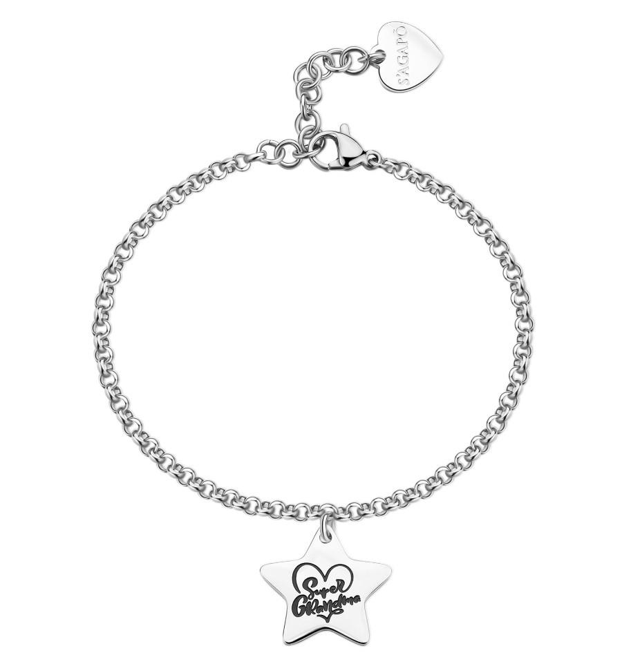 Bracciale in acciaio 316L con pendente a forma di stella con scritta "Super Grandma" in smalto nero su fronte e scritta "Ti voglio bene nonna" in smalto nero su retro.