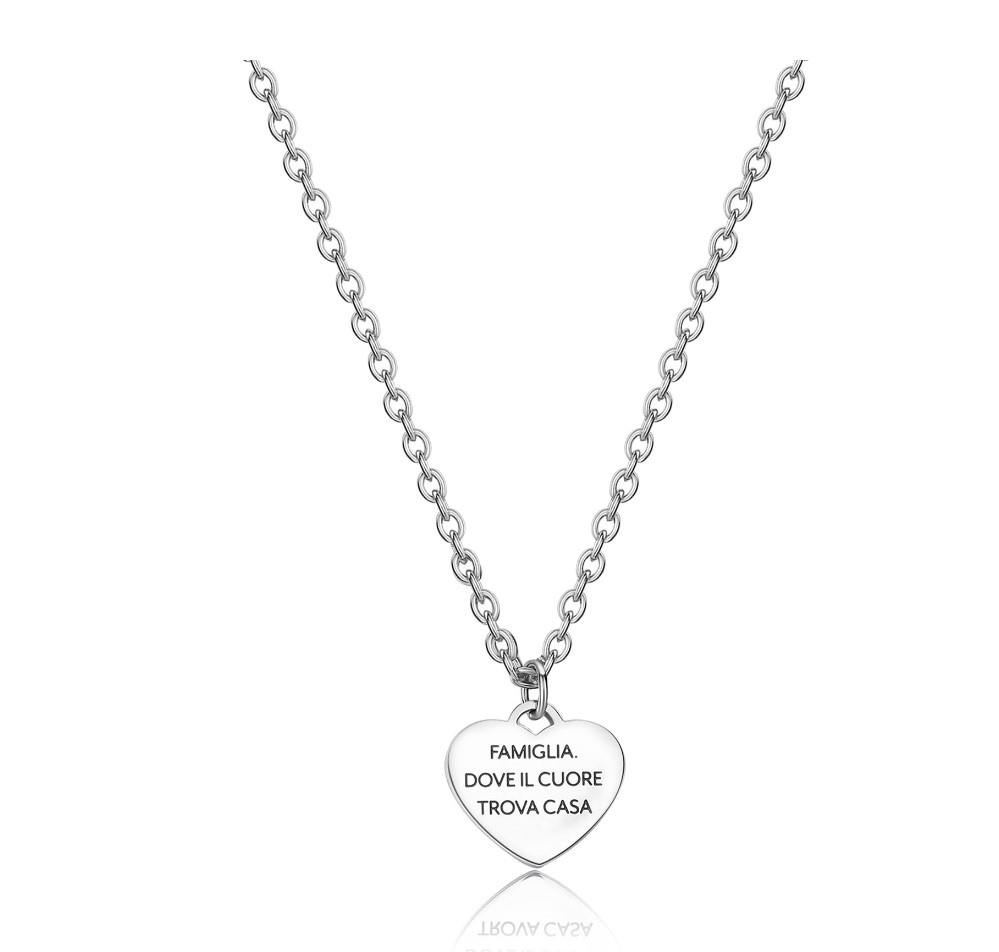 Collana girocollo in acciaio 316L con pendente a forma di cuore con scritta "Family is forever" in smalto nero e cuore in smalto rosso su fronte e scritta "My best friend" in smalto nero su retro.