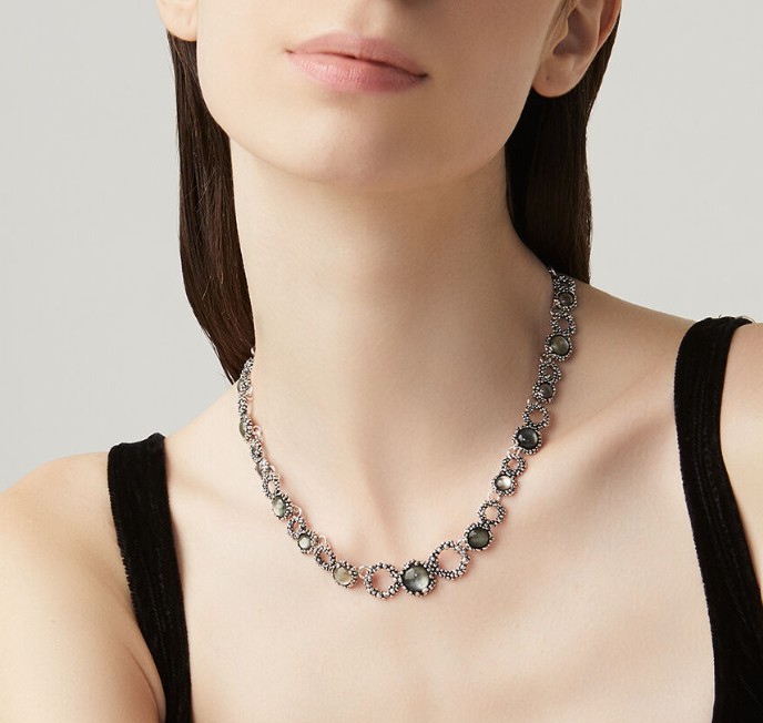 I sofisticati colori dell'alba riflessa sul grande oceano e la sapiente scelta di materiali hanno ispirato questa collana, connubio perfetto tra argento brunito e madreperla. I riflessi cangianti, in contrasto con l'effetto chiaroscurale della finitura brunita, impreziosiscono il collo di una donna elegante. Indossala con gli orecchini modello bottone della stessa collezione per una straordinaria dichiarazione di stile.DettagliArgento 925, madreperla e quarzo ialinoLunghezza 42 cm regolabileChiusura con moschettoneFatto a mano in ItaliaSKU:10680
