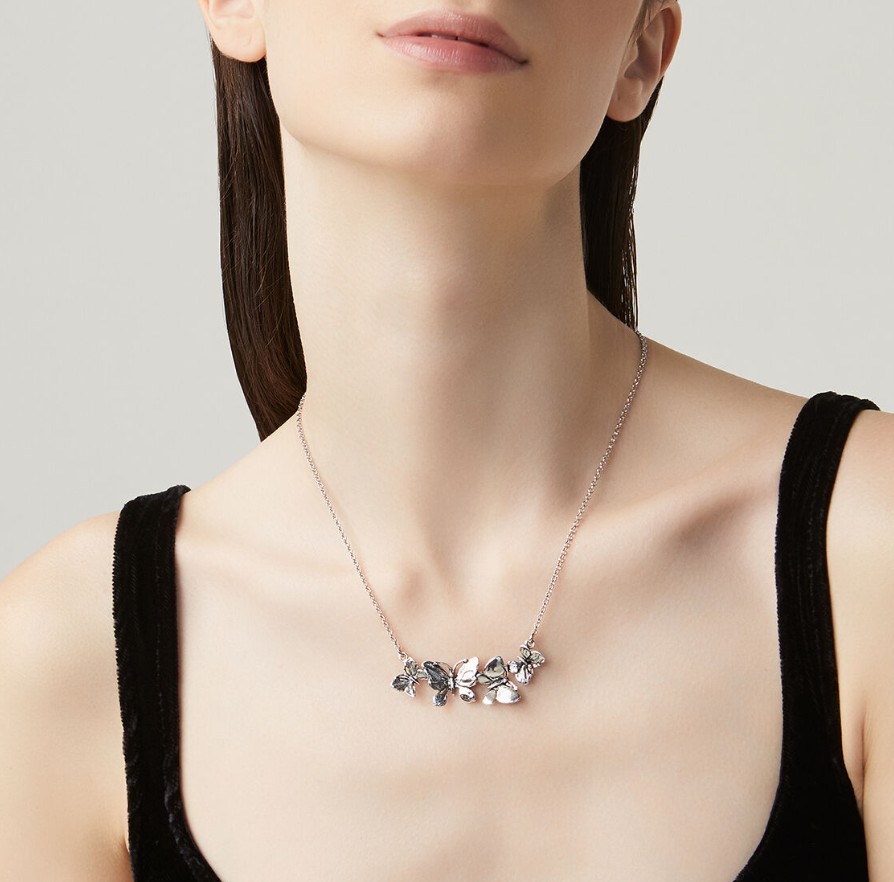 Quattro meravigliose farfalle in argento brunito sono le protagoniste di questa particolarissima collana. Il decoro è agganciato ad una catena, sempre in argento, di 45 centimetri. Realizzata a mano in azienda.DettagliArgento 925Lunghezza 45 cmChiusura con moschettoneFatto a mano in ItaliaSKU:9540