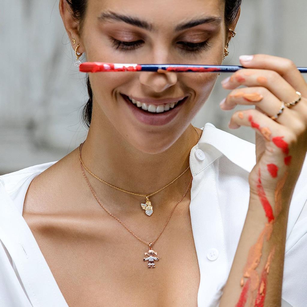 Girocollo con zirconi e soggetto angiolettoSoggetto: Angioletto Finitura disponibile: Placcatura oro rosa 18kt o placcatura oro giallo 18kt Materiale: Argento 925 Grandezza soggetto: 2 cm Lunghezza Girocollo: 40 cm + 3 cm