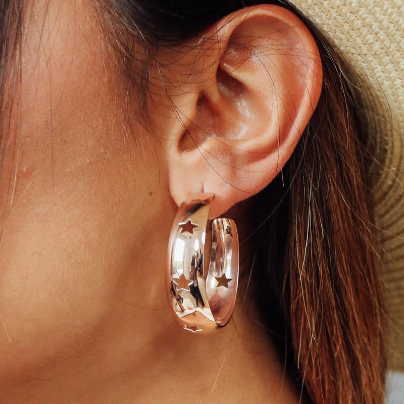 Orecchini bombatiCerchio con soggetto traforatoDiametro: 4 cmArgento 925%, galvanica oro rosa.