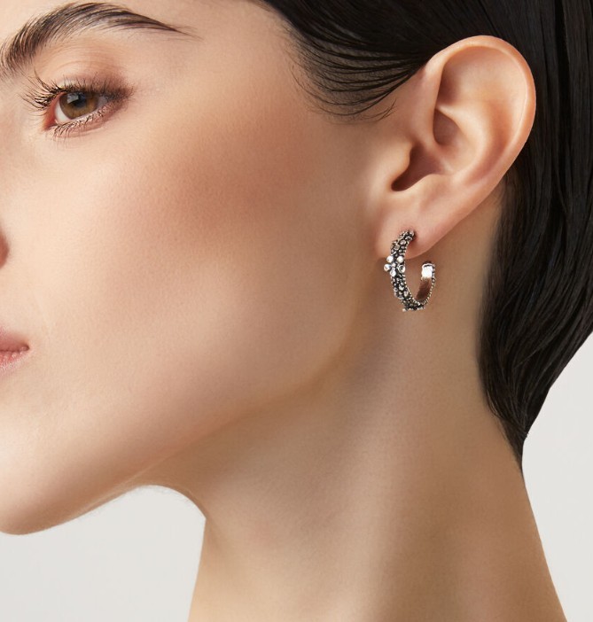 Tutta la delicatezza del micro mondo floreale in questi orecchini a cerchio Giovanni Raspini. La lavorazione artigianale della fusione a cera persa su argento brunito, è qui abbinata all'effetto della diamantatura, che conferisce ai minuscoli e graziosi petali un effetto scintillante.