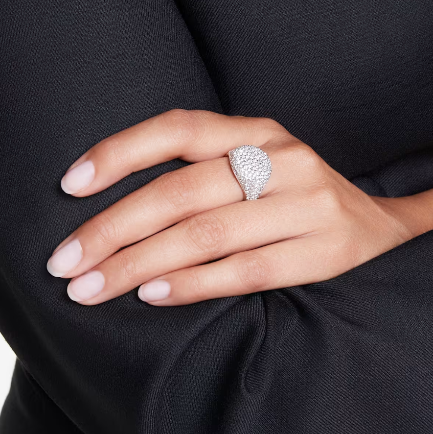 Questo scintillante anello a motivo farà risplendere ogni outfit con la sua costellazione di cristalli. La fascia placcata rodio presenta un’audace cupola impreziosita da un pavé a neve di cristalli Cry rotondi di diverse dimensioni. L’effetto cluster è ipnotico e vivace – ne risulta un anello dallo stile incantevole che si impone.