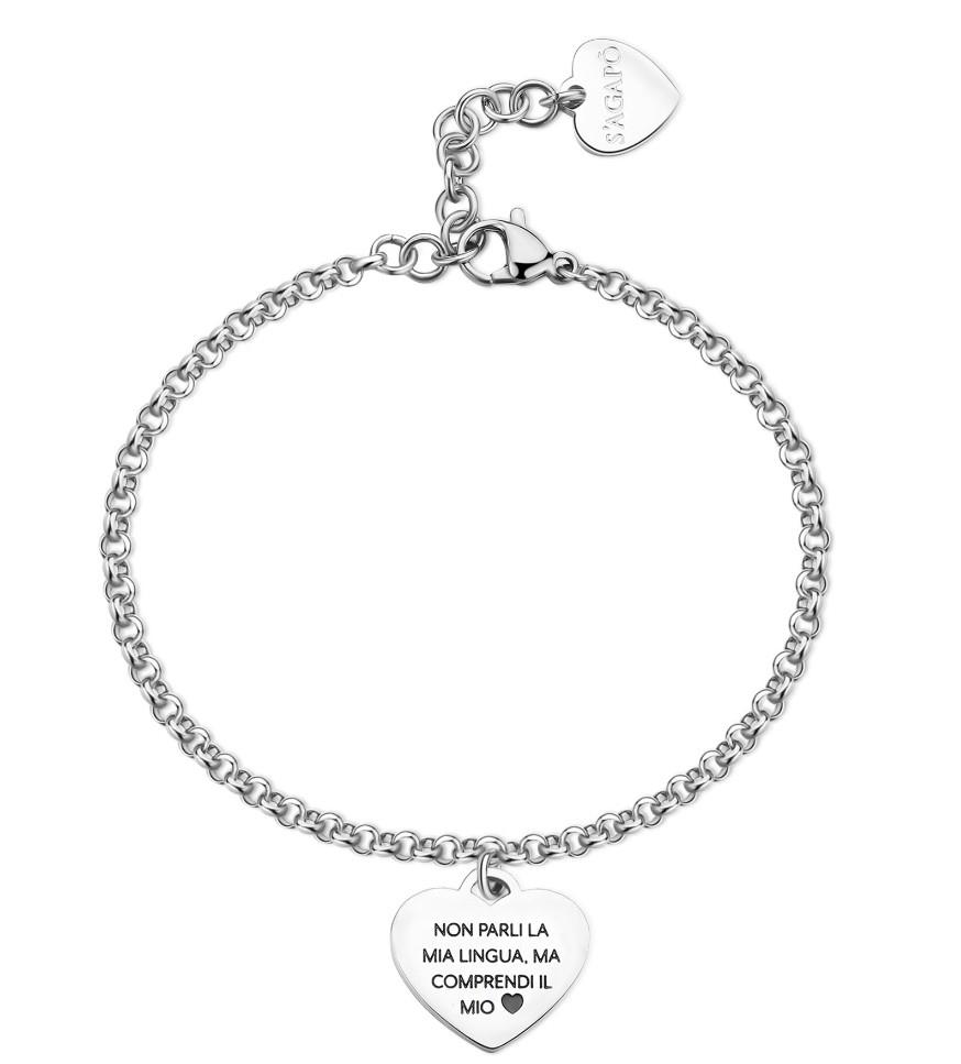Bracciale in acciaio 316L con pendente a forma di cuore con cane in smalto nero e cuore in smalto verde su fronte e scritta "Non parli la mia lingua ma comprendi il mio cuore" in smalto nero su retro.