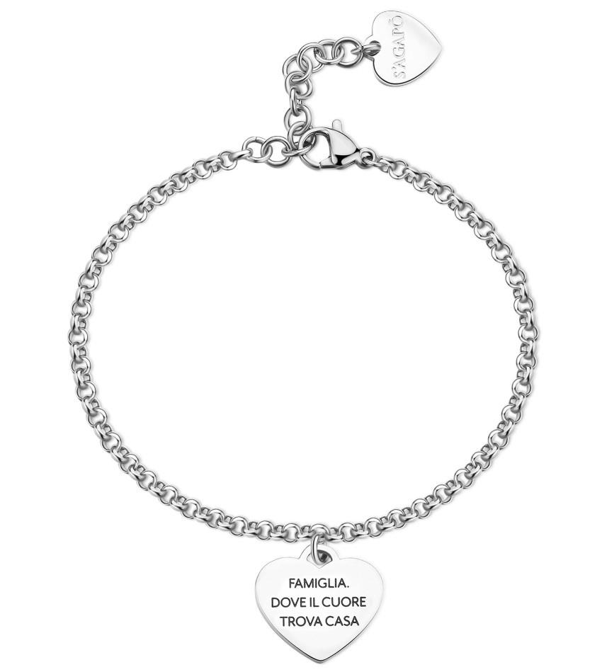 Bracciale in acciaio 316L con pendente a forma di cuore con scritta "Family is forever" in smalto nero e cuore in smalto rosso su fronte e scritta "Famiglia. Dove il cuore trova casa" in smalto nero su retro.