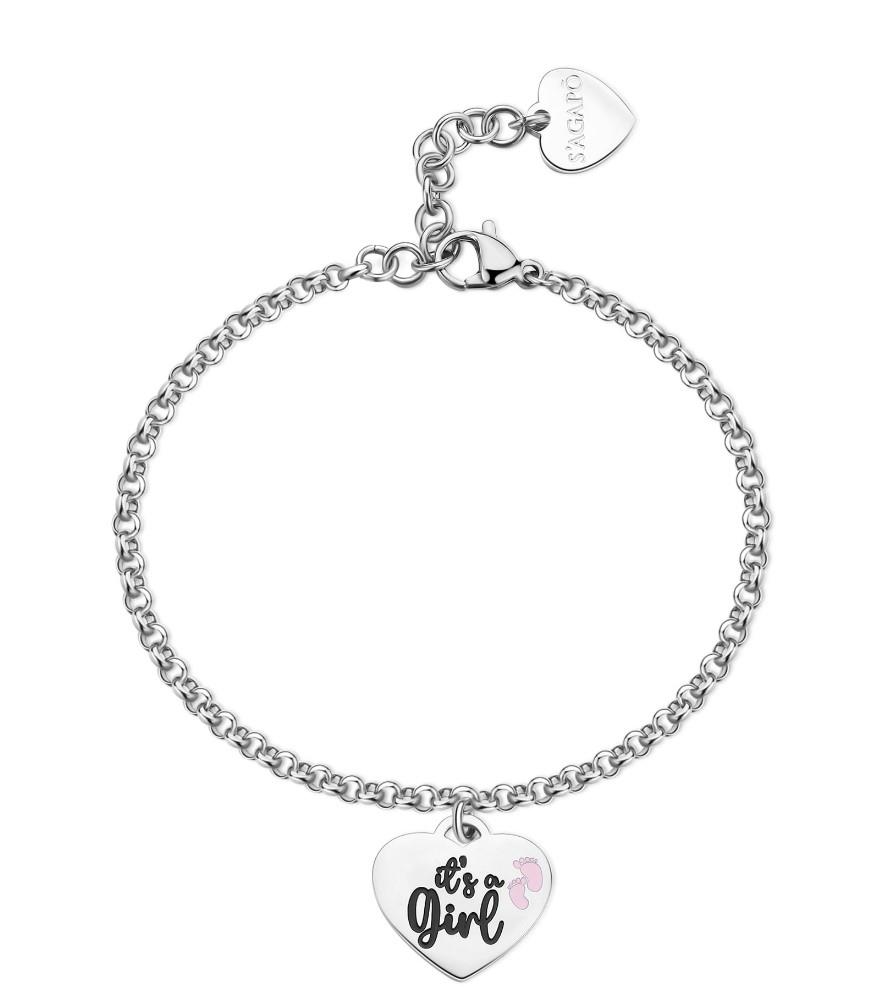Bracciale in acciaio 316L con pendente a forma di cuore con scritta "It's a girl" in smalto nero e piedini in smalto rosa su fronte e scritta "Benvenuta ad una nuova vita" in smalto nero su retro.