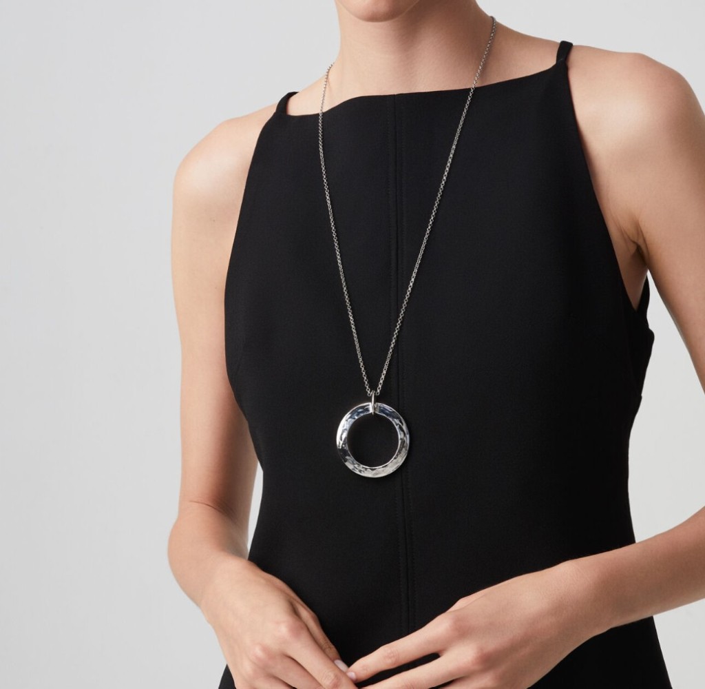 Questo pendente è un gioiello in argento fortemente materico, con texture che regalano una straordinaria lucentezza, e racconta tutto l'amore di Giovanni Raspini per il design contemporaneo. Fatto a mano in lastra d'argento martellata e agganciato ad una sottile catena rolò di ottanta centimetri sempre in argento.DettagliArgento 925Lunghezza catena 80 cmLunghezza pendente 6,2 cmChiusura con moschettoneFatto a mano in ItaliaSKU:12094