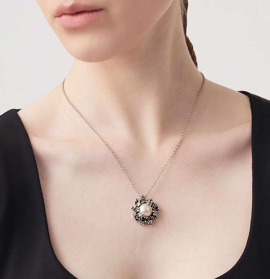 Incastonata in un decoro floreale in argento brunito, la grande perla rosa naturale d'acqua dolce si trasforma in questo pendente elegantissimo e luminoso. L'argento brunito è lavorato a mano con fusione a cera persa, ed è reso ancora più lucente grazie alla diamantatura posta sui petali dei micro fiorellini.DettagliArgento 925 e perle rosa naturaliLunghezza catena 45 cmLunghezza pendente 1,5 cmChiusura con moschettoneFatto a mano in ItaliaSKU:11937